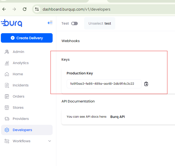 - Paste the API key into the Burq app settings.